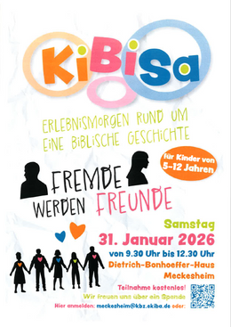 Der KiBiSa findet einmal im Jahr statt, wir sind im Moment ein Team von ca. 18 MitarbeiterInnen und würden uns über neue HelferInnen sehr freuen. Wir treffen uns in der Regel zwei Mal zu einer Vorbesprechung. Ansprechpartner sind Judith Kress (Tel: 6 04 66) und Angela Maurer (Tel: 99 16 74) oder über das Pfarramt.